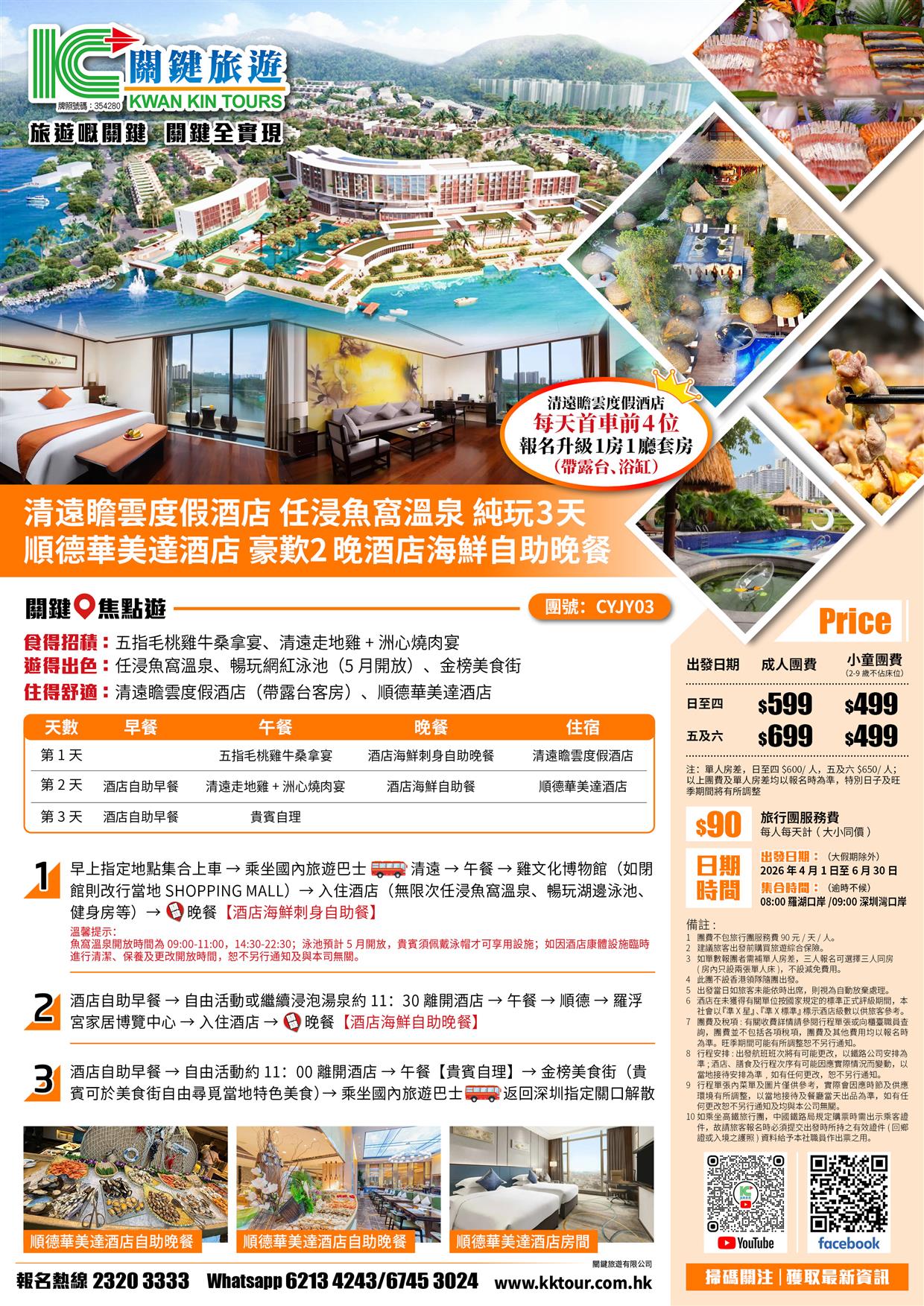 清遠瞻雲度假酒店 任浸魚窩溫泉 順德華美達酒店 歎2晚酒店自助晚餐 純玩3天