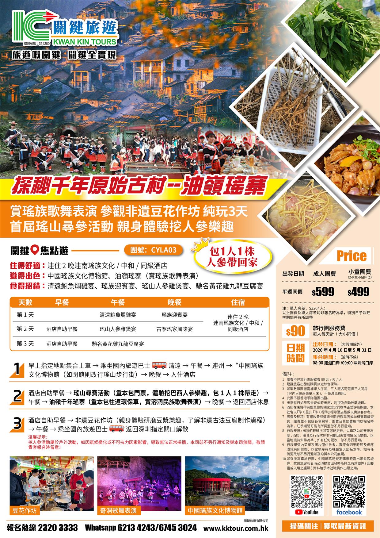 首屆瑤山尋參活動 親身體驗挖人參樂趣 千年原始古村--油嶺瑤寨 賞瑤族歌舞表演 純玩3天