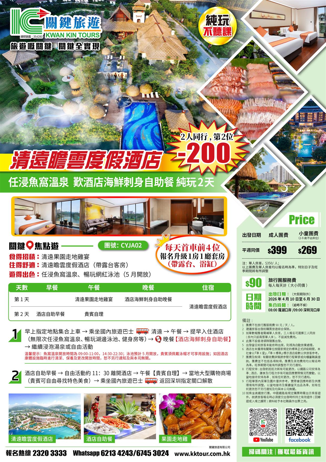 (2人同行第2位-200)清遠瞻雲度假酒店 歎酒店自助晚餐 純玩2天