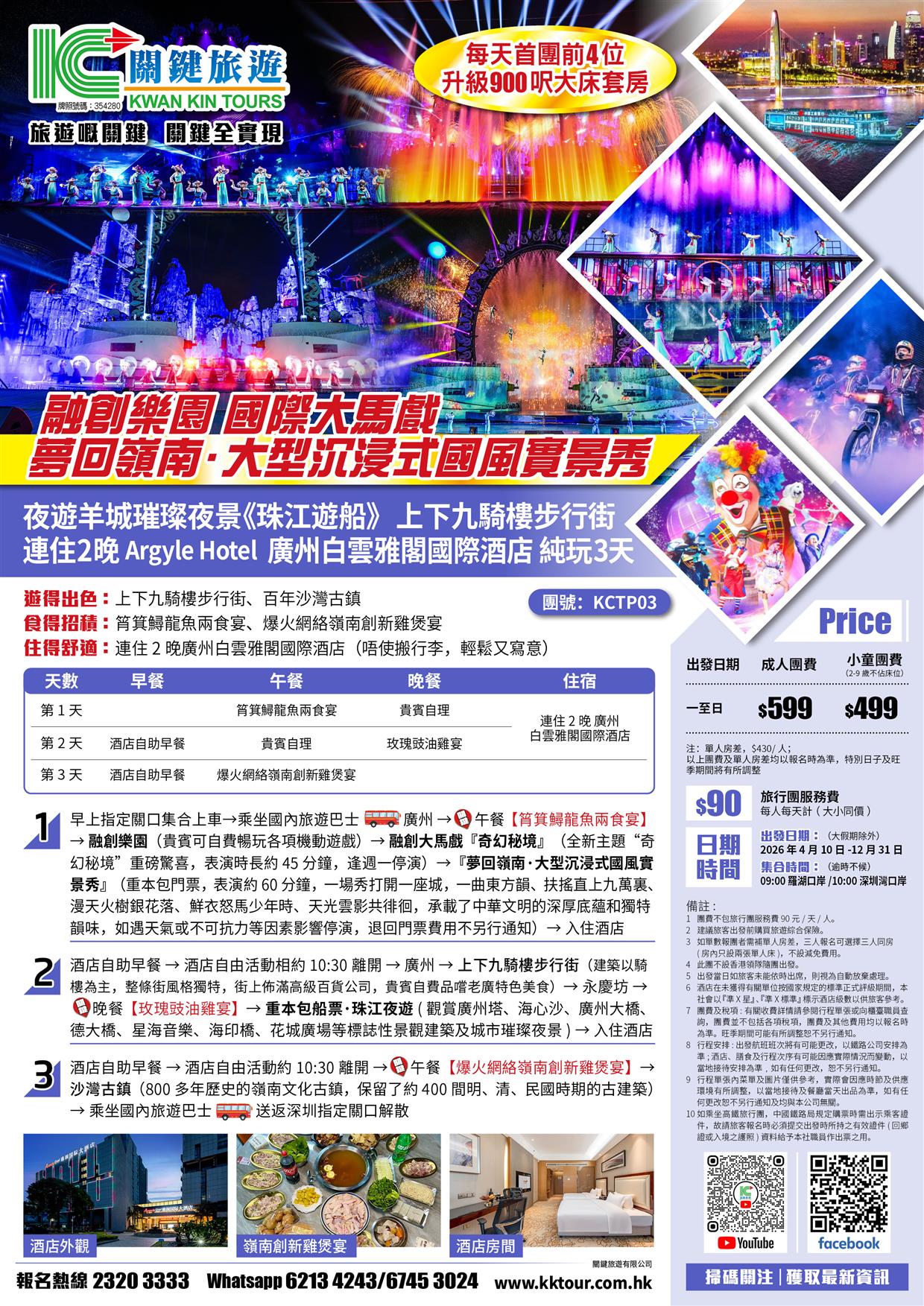 廣州融創馬戲+夢回嶺南大型國風實景秀、珠江遊船賞羊城璀璨夜景、連住2晚廣州白雲雅閣國際酒酒店純玩3天
