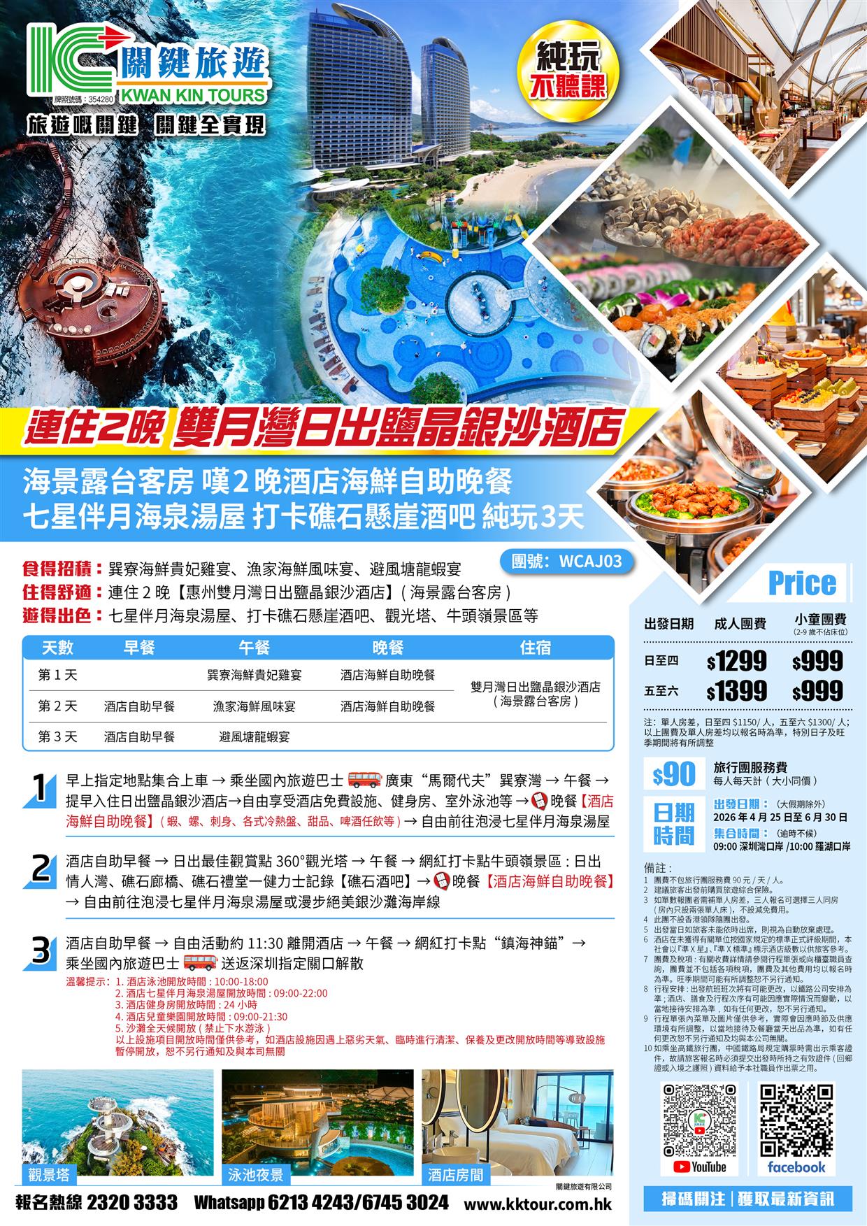 連住2晚 雙月灣日出鹽晶 銀沙酒店(海景露台客房) 嘆2晚酒店海鮮自助晚餐 打卡礁石懸崖酒吧純玩3天