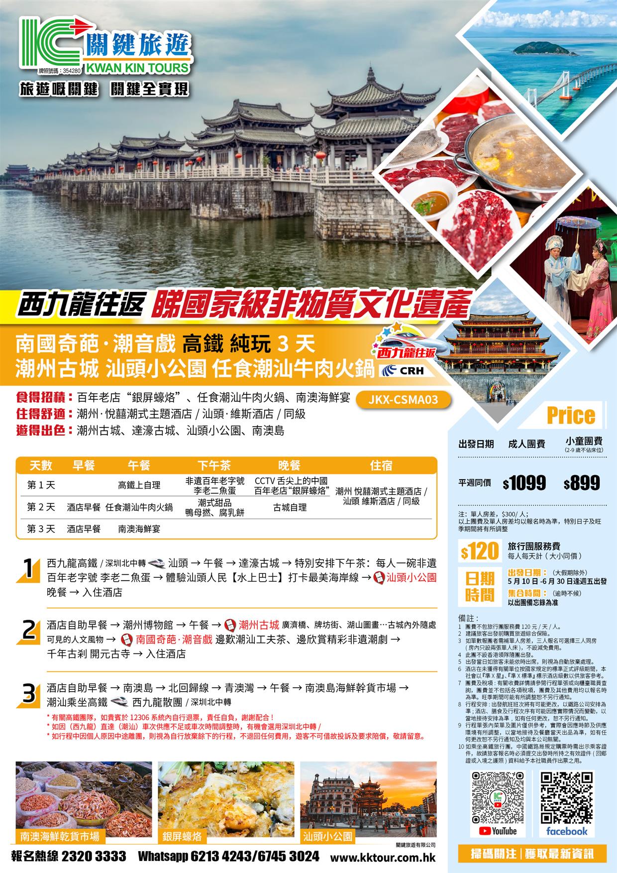 西九龍往返高鐵 潮汕 觀看國家級非物質文化遺產 南國奇葩.潮音戲 任食潮汕牛肉火鍋 純玩3天
