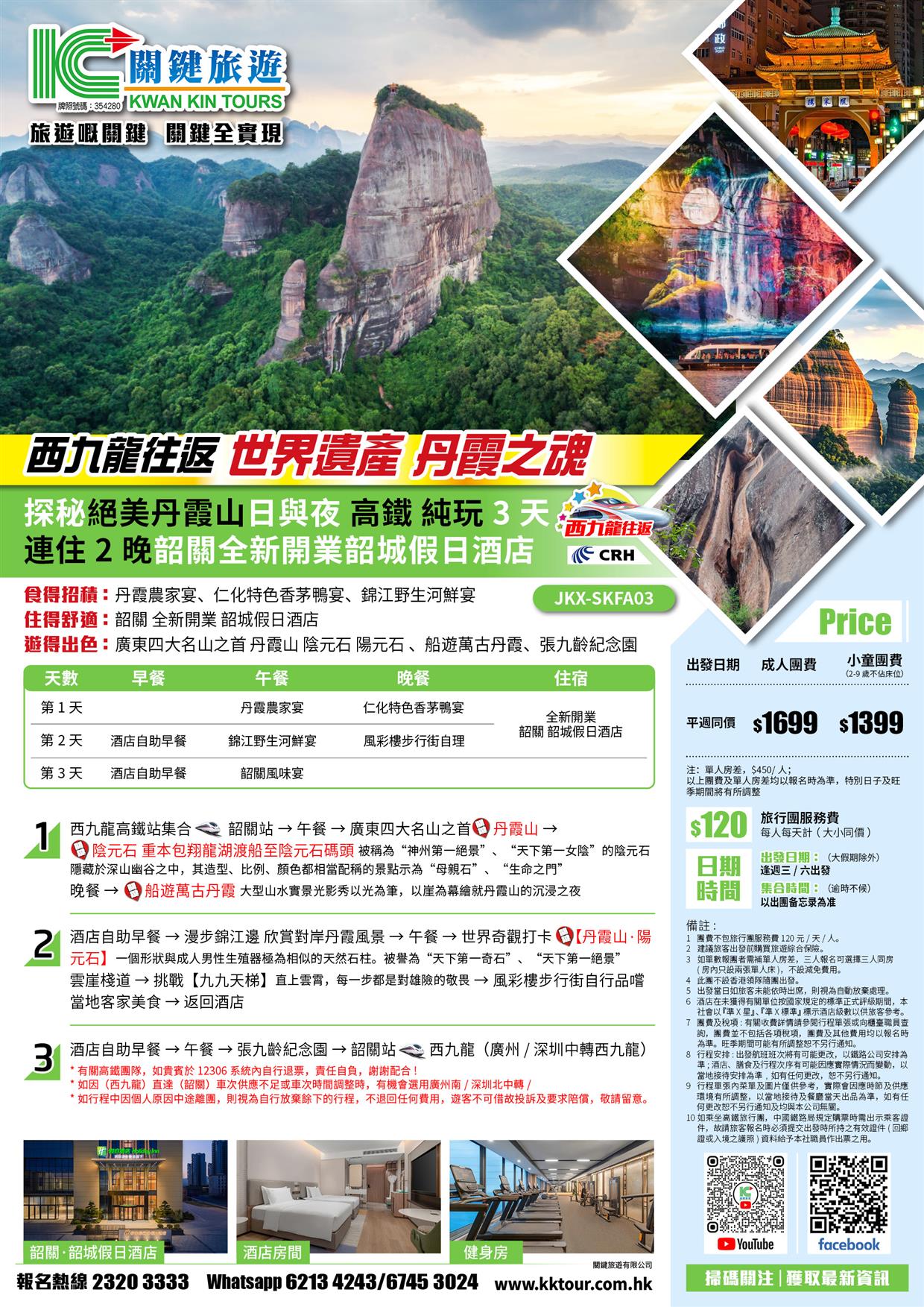 西九龍往返 世界遺產.丹霞之魂 探秘絕美丹霞山日與夜 連住2晚韶關全新開業.【韶城假日酒店】純玩3天