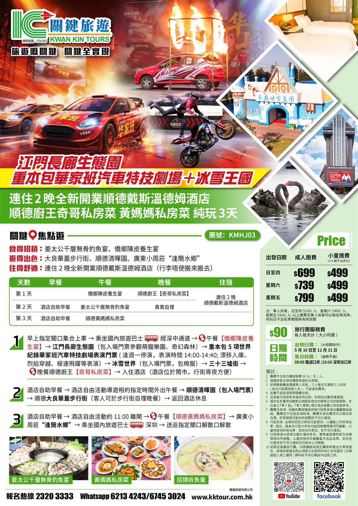 江門長廊生態園(華家班汽車特技劇場表演、冰雪王國)連住2晚順德戴斯溫德姆酒店 奇哥私房菜純玩3天