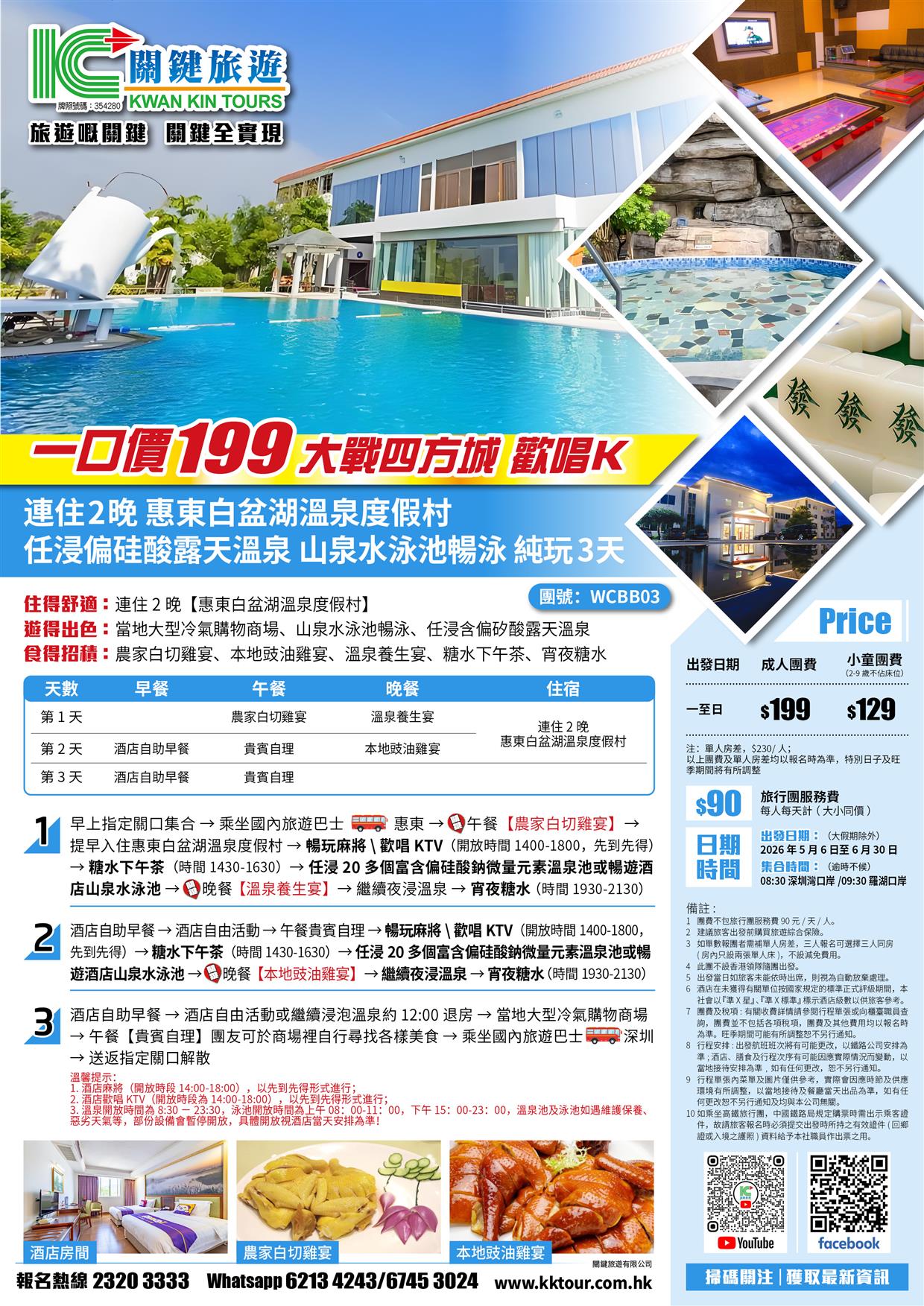 一口價199 連住2晚 惠東白盆湖溫泉度假村 任浸偏硅酸露天溫泉 山泉水泳池暢泳 純玩3天