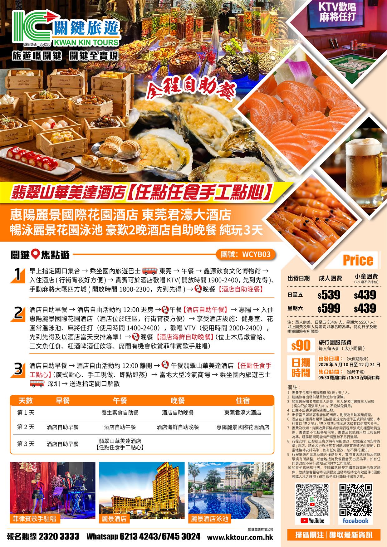 全程自助餐 翡翠山華美達酒店【任點任食手工點心】惠陽麗景國際花園酒店+東莞君濠大酒店 純玩3天